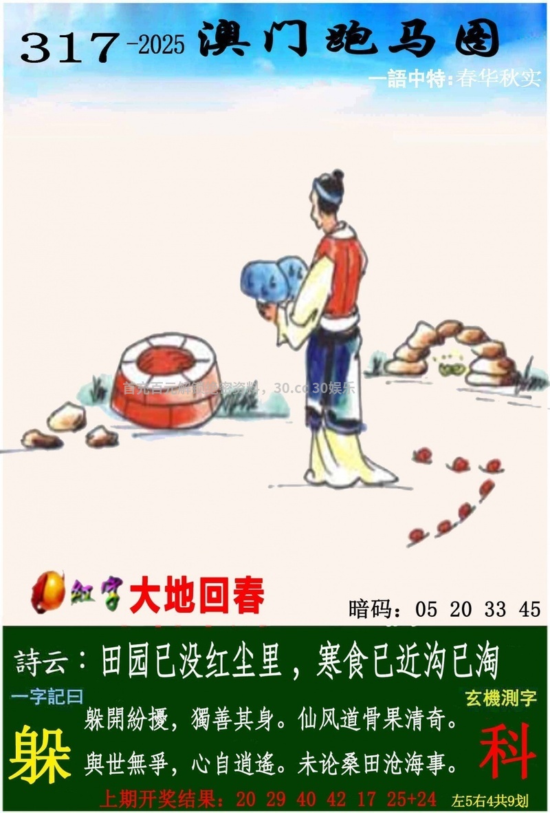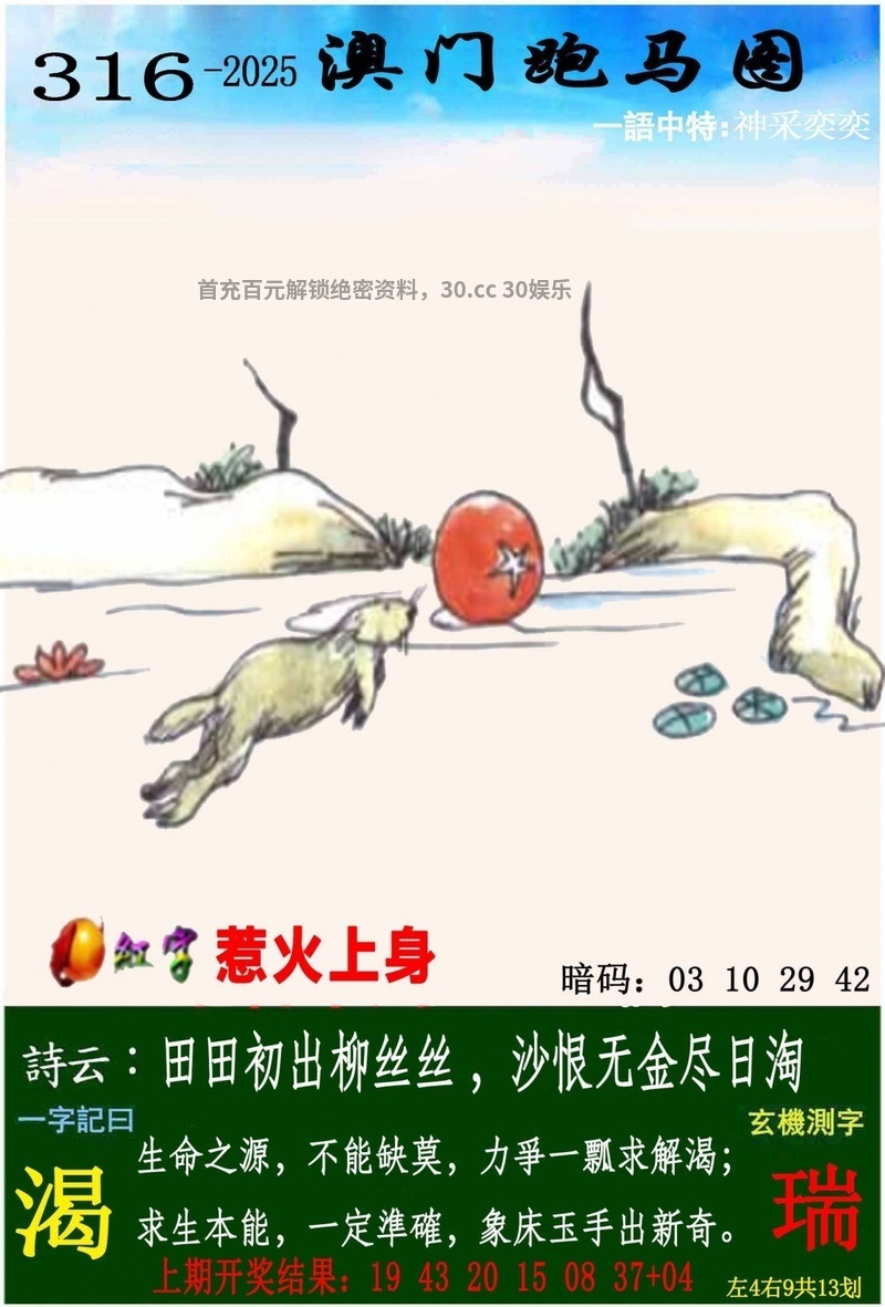 | 319期一字記曰:【奔】 为口奔驰,为势所逼,羽翼未丰也抢食。一分收获,十分努力,适者生存要积极。《注》 解:含桃庄主后园深:后园深解后肖狗鸡猴猪马羊。 生肖:狗鸡猴猪马羊 |