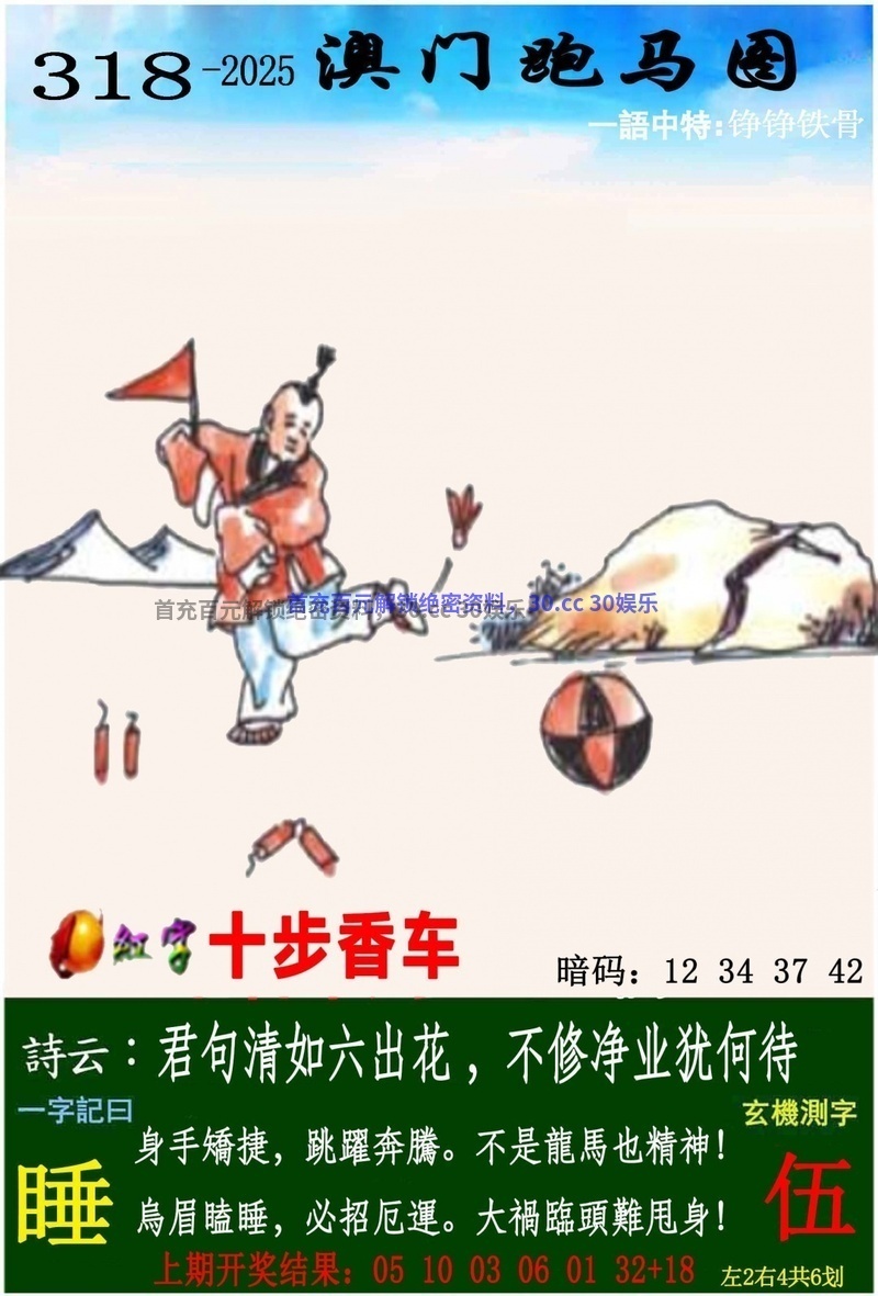 | 318期一字記曰:【睡】 身手娇捷,跳躍奔腾,不是龙马也精神。乌眉瞌睡,必招厄运,大祸临头难甩身。《伍》 解:大祸临头难甩身:大祸临头解凶肖猪牛狗虎鼠猴。 生肖:猪牛狗虎鼠猴 |